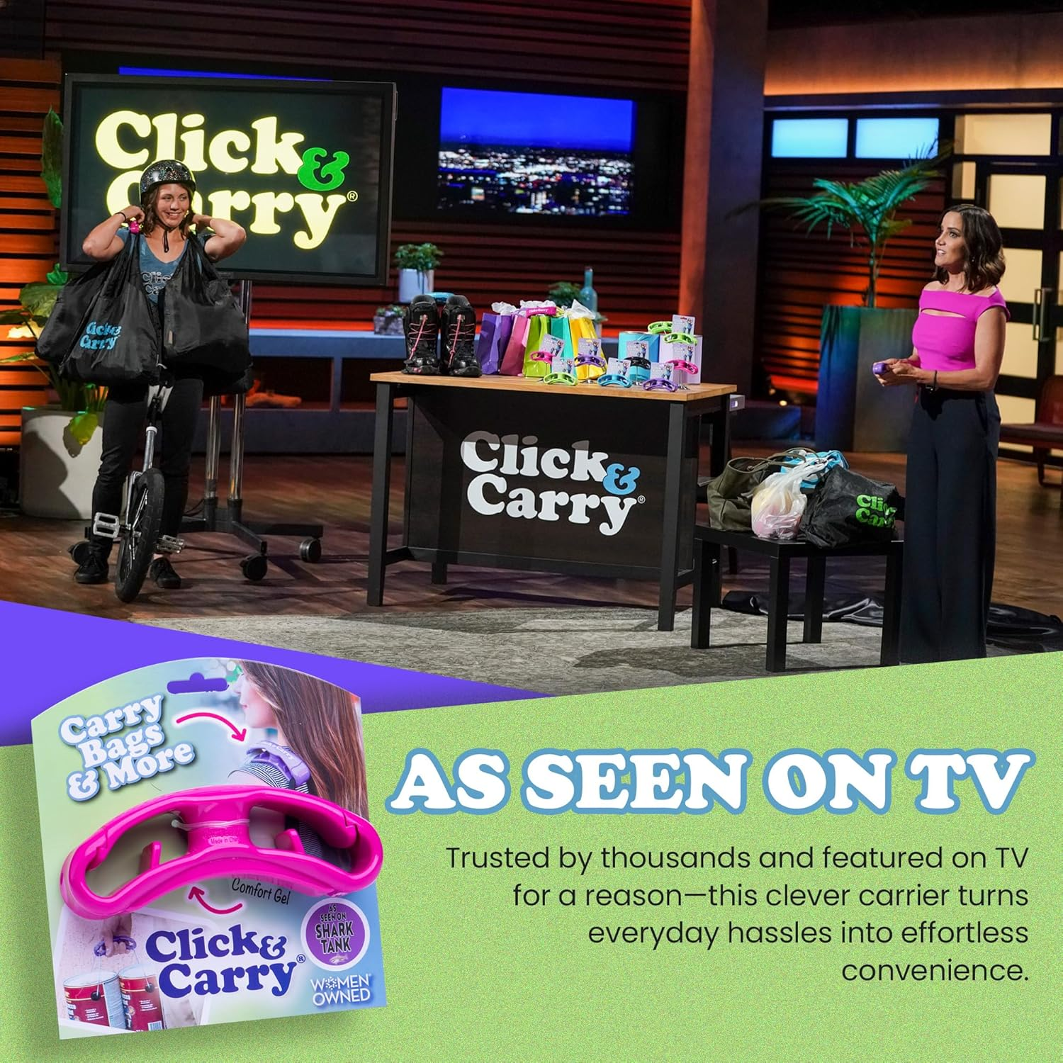 Hands-free solution: Your grocery bag carrier handle becomes a shoulder companion. The click and carry design balances up to 100 lbs. across your shoulder, leaving hands free for keys or phone