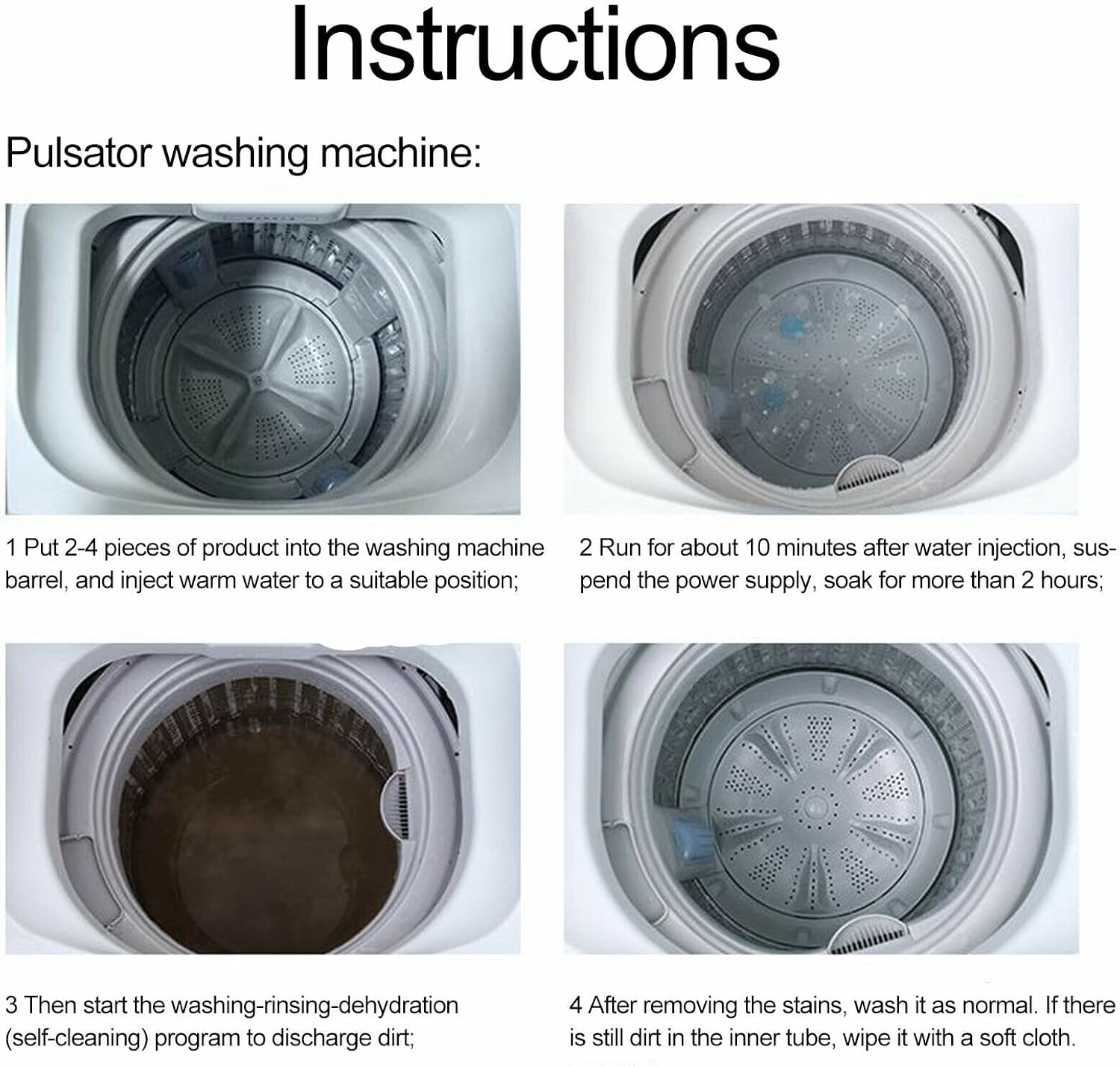 Easy operation: Just empty the washing machine. Add 2-3 washing machine tablets. Then start a full wash cycle without disassembling the washer. Applicable to any type of washing machine.