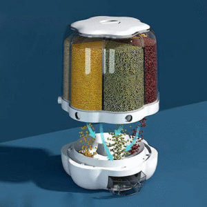 Practical grain box: Round dispenser with 6 grids supports classified storage and push button to get food. The transparent swivel is visible, making it easy to observe the capacity.
