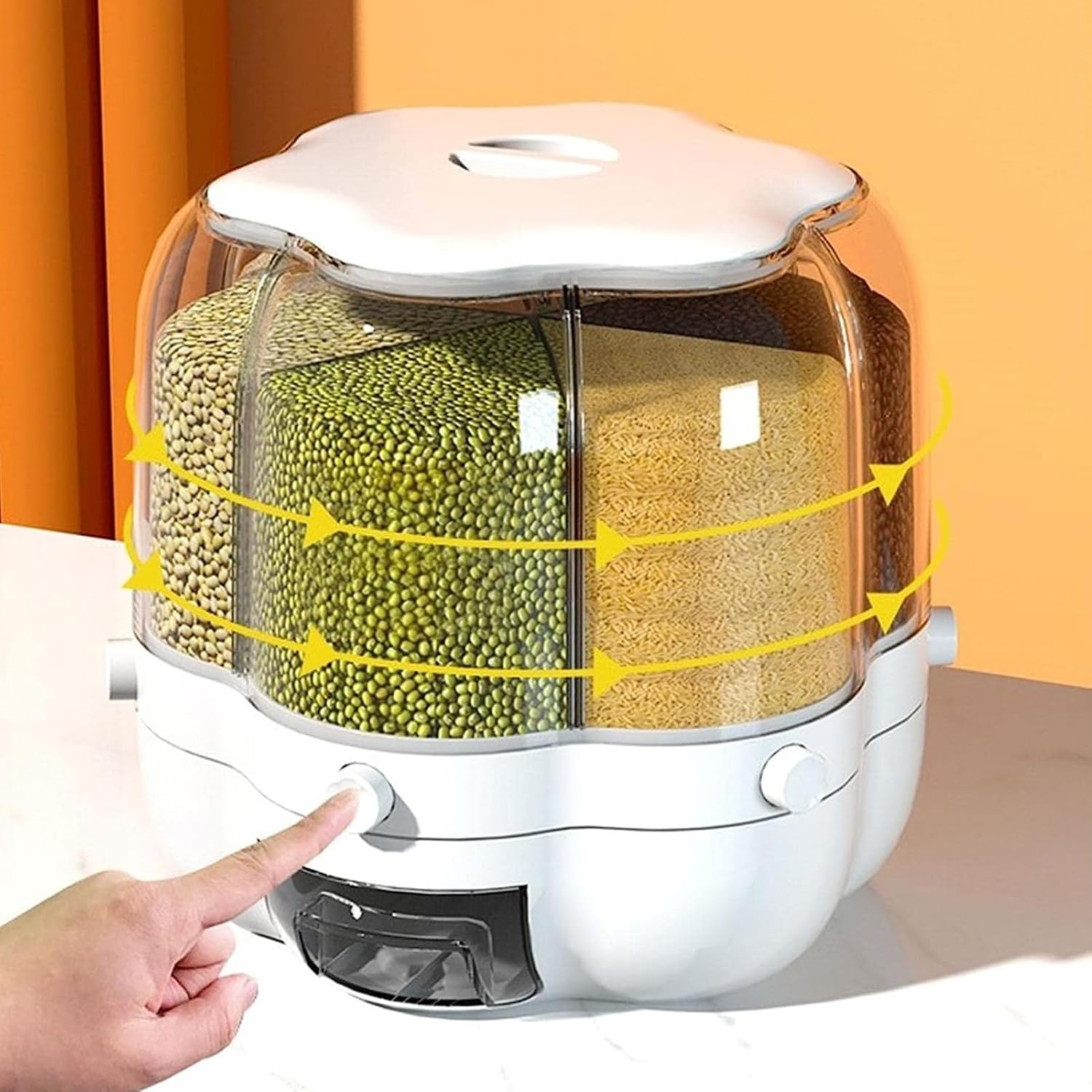Rice Dispenser, 360°Rotating Transparent Rice Dispenser,6 Grid Visualisation Rice Storage Container with Airtight Lid and Rice Cup, for Home Kitchen Food Grain Storage Container