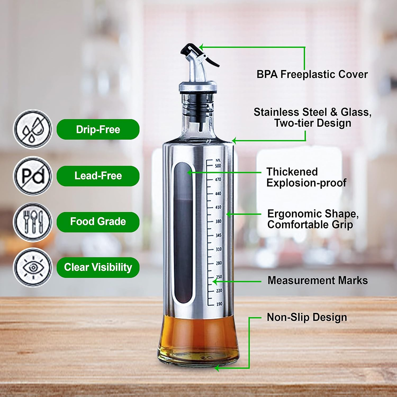 High quality: Made of high-quality lead-free glass and stainless-steel material, The oil bottle more textured and firmer,100% food-grade glass. It will not be to produce other substances that are harmful to health.